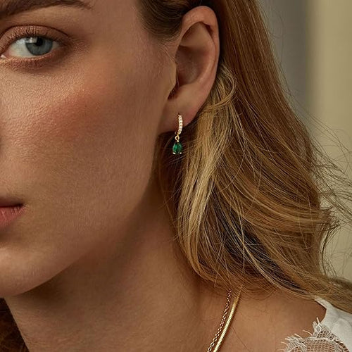 Dangle Earrings for Women Trendy 14K Gold Plated Hypoallergenic Drop Hoop Earrings Dainty Diamond Green Emerald Birthstone Huggie Earrings for Birthday Gifts